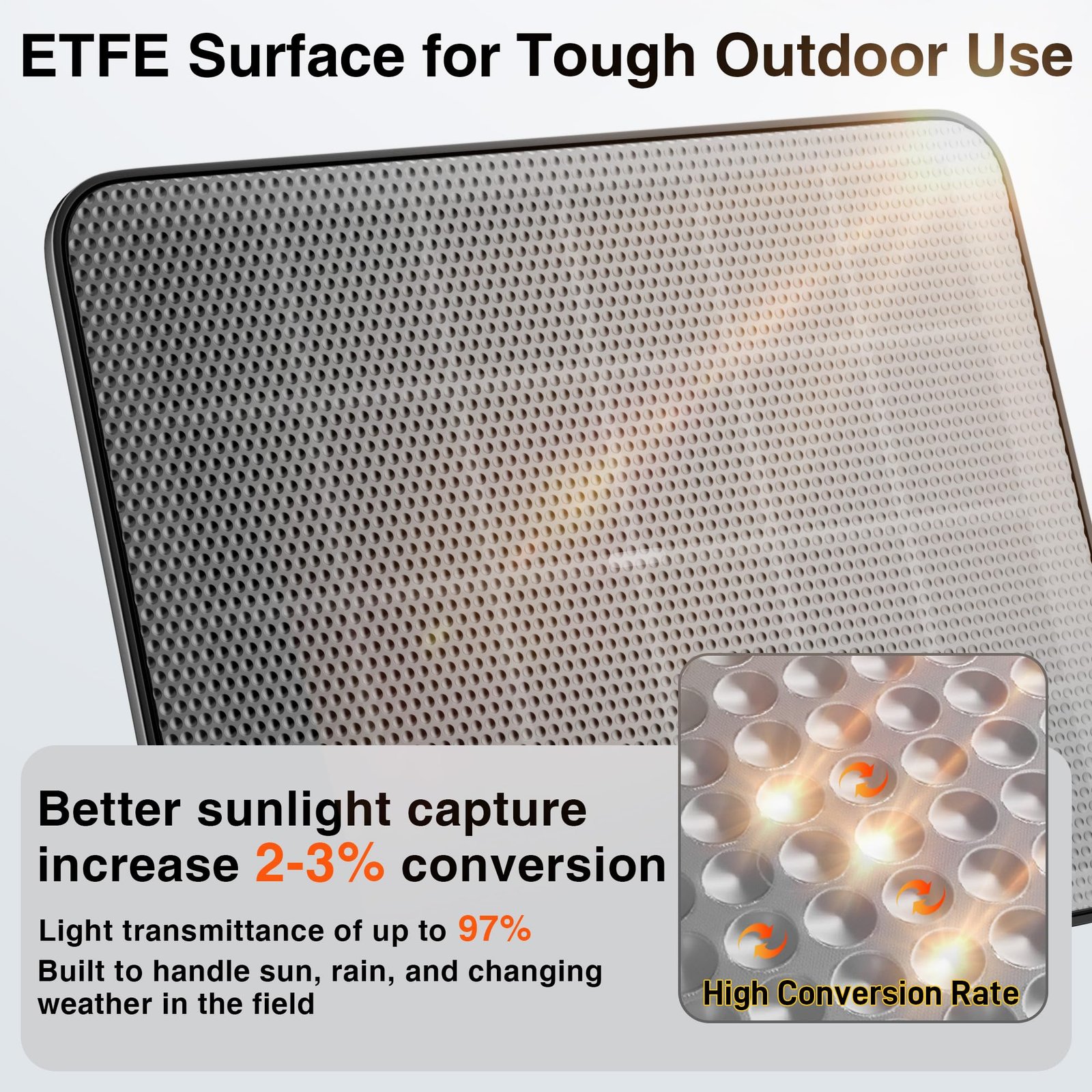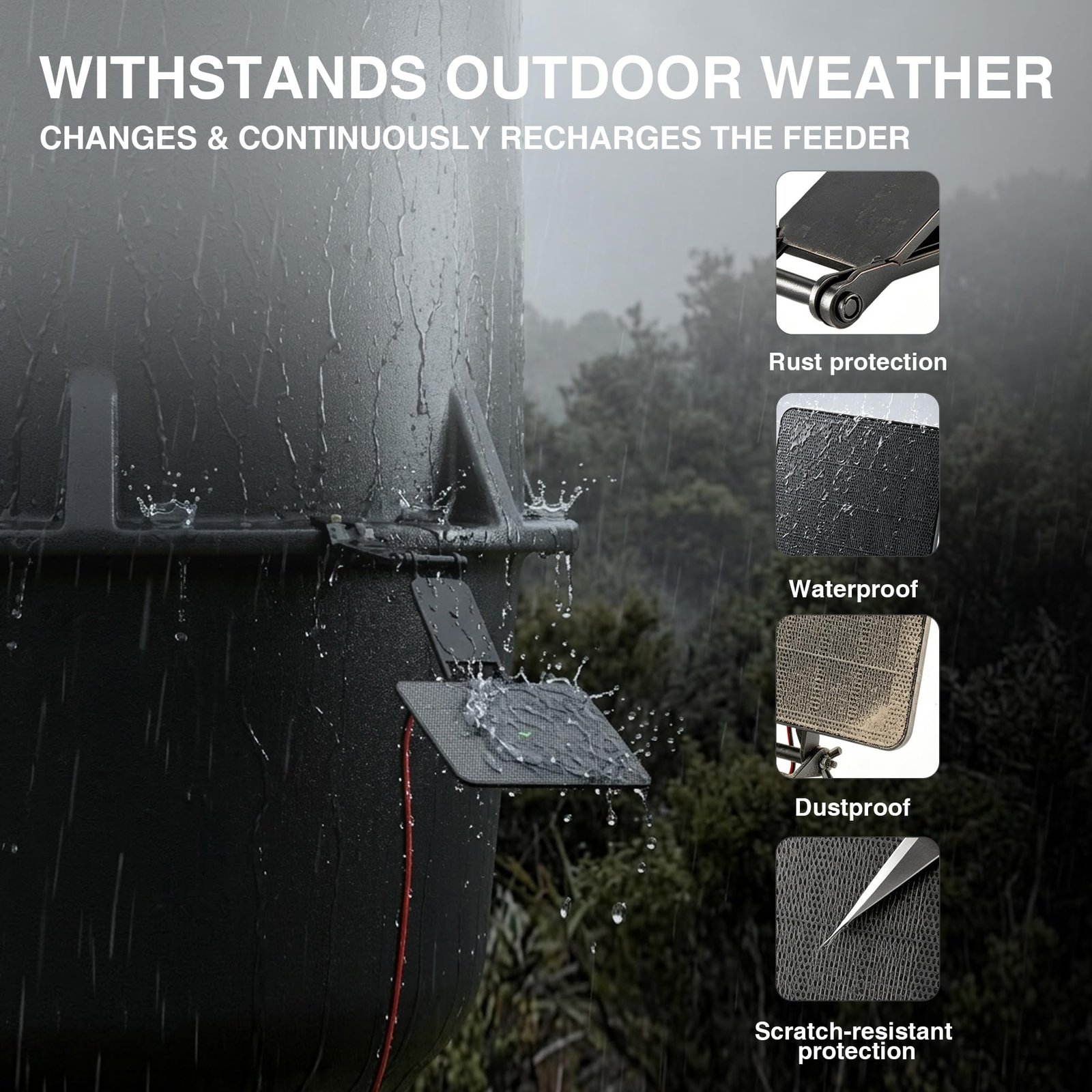 - ETFE Surface for Outdoor Durability: This premium ETFE solar panel features industry-leading waterproof, UV-resistant and scratch-proof performance. Unlike fragile PET panels that age quickly in harsh wild weather, it can effectively absorb up to 98% of sunlight and increases energy conversion by 3% compared to standard PET material, delivering significantly faster charging speed to fully power your feeder batteries in a shorter time. It eliminates frequent replacements, serving as a reliable long-term deer feeder battery charger and game feeder battery charger.
