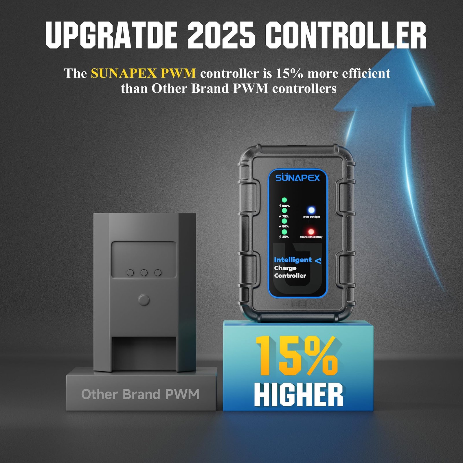 - Maximized Energy Efficiency: SUNAPEX's newly upgraded MPPT smart charge controller squeezes up to 34% more power from solar panels compared to traditional PWM controllers, ensuring your battery gets every possible joule of energy