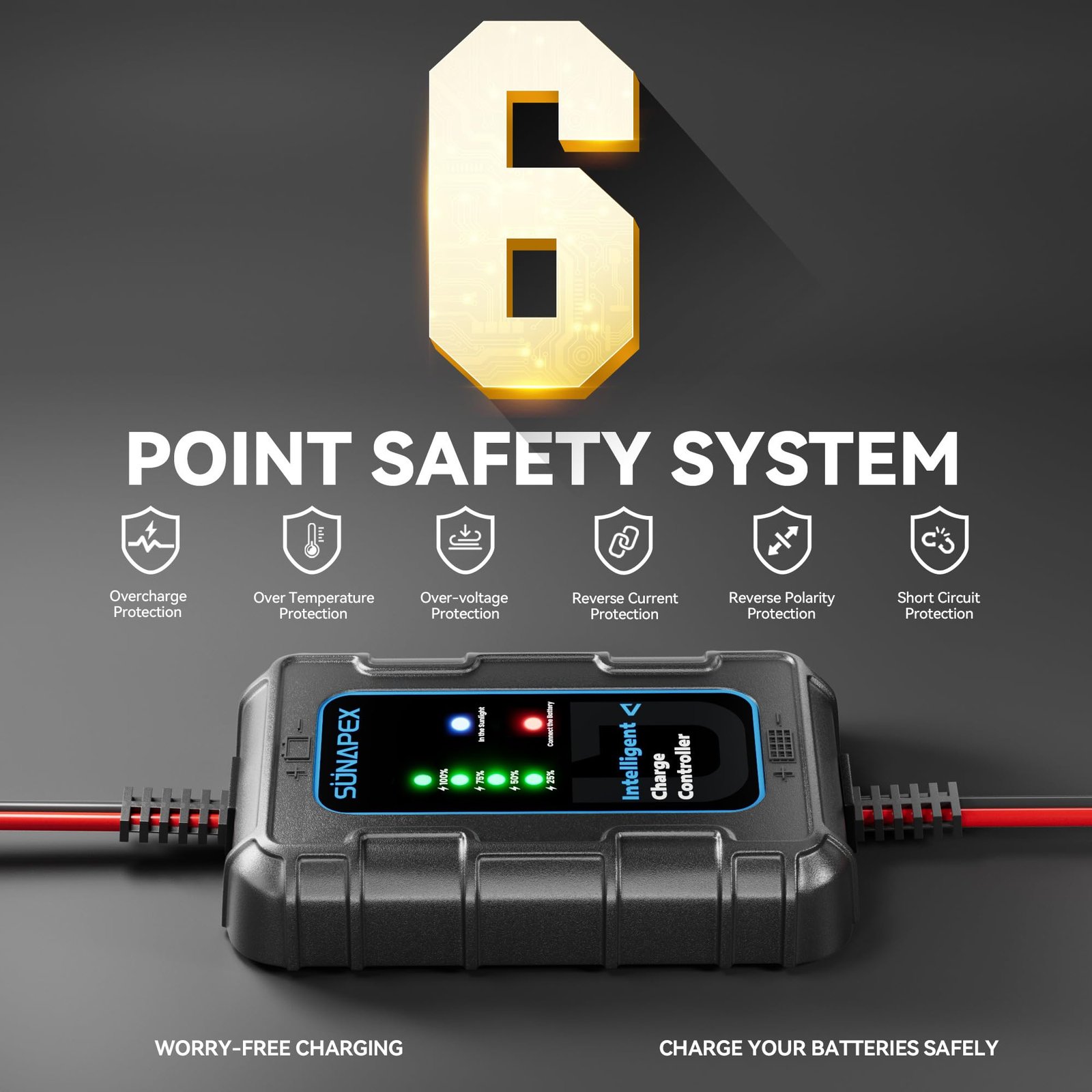 - Comprehensive Safety Measures: Built-in with multiple safeguards including overcharge; overvoltage; reverse current; reverse polarity; short circuit and over-temperature protection, ensuring your battery charges safely and efficiently